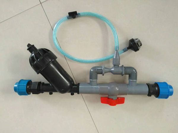 文丘里施肥器與微灌系統(tǒng)或灌區(qū)入口處的供水管控制閥門并聯(lián)安裝,使用時(shí)將控制閥門關(guān)小,造成控制閥門前后有一定的壓差,使水流利經(jīng)過(guò)安裝文丘里施肥器的支管,用水流通過(guò)文丘里管產(chǎn)生的真空吸力,將肥料溶液從敞口的肥料桶中均勻吸入管道系統(tǒng)進(jìn)行施肥。